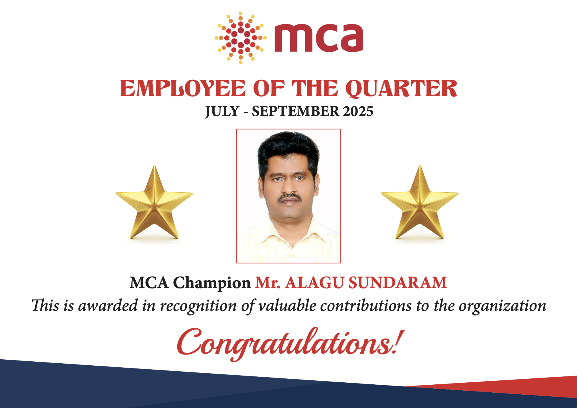 MCA Champion of the Quarter – September 2025 webmca October 14, 2025 We are pleased to announce that Alagu Sundaram has been chosen as the MCA CHAMPION (Employee of the Quarter) for